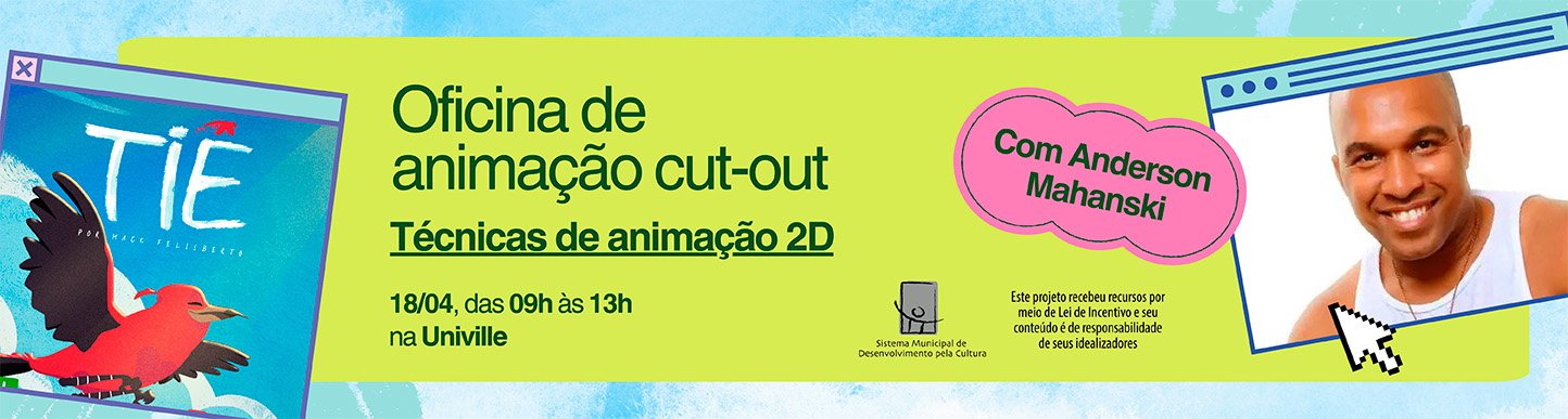 No dia 18/04, das 09h às 13h, na Univille, você terá a oportunidade de mergulhar no universo da criação visual e de técnicas para animação com Anderson Mahanski.
